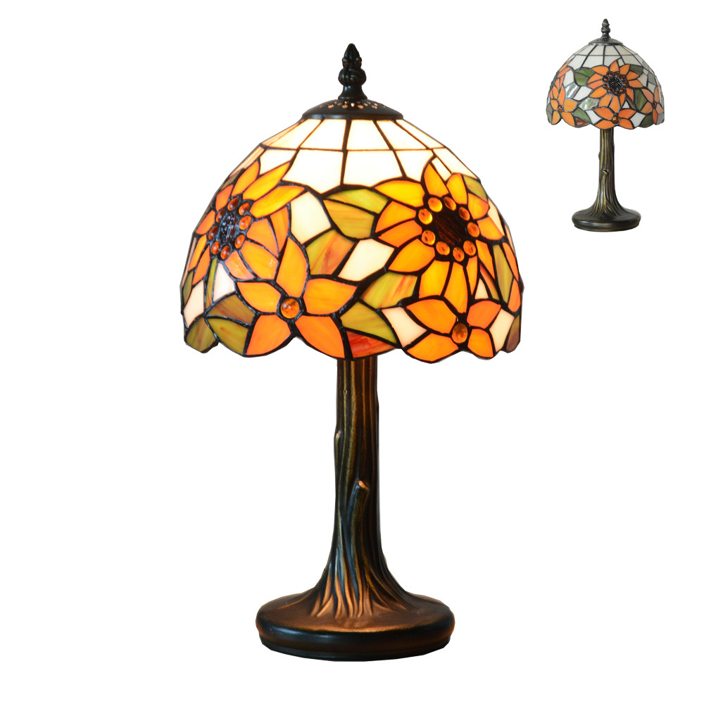 Fiatalos megjelenésű Tiffany asztali lámpa, bronz színű, díszes fém vázzal és narancsos, aprólékosan kidolgozott, virág mótívumos, Tiffany üveg búrával. A lámpa vezetékre szerelt kapcsolóval rendelkezik.