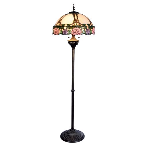 Bronzos barna színű polyresin vázas álló lámpa 50cm átmérőjű, bézses árnyalatú alapon piros-rózsaszín és kékes lilás árnyalatú rózsa dekoros, díszes Tiffany üveg búrával, húzókapcsolóval. A lámpában 3db külön kapcsolható E27-es foglalat található.