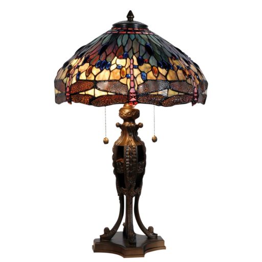 Bronz színű polyresin vázas Tiffany asztali lámpa Tiffany üveg búrával, húzókapcsolóval.