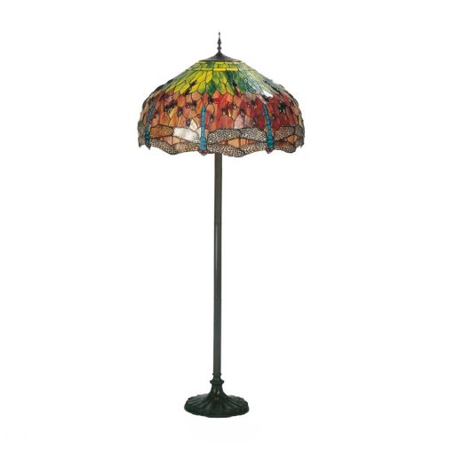 Bronzos barna színű polyresin vázas álló lámpa 60cm átmérőjű szitakötő dekoros, dominánsan zöld és narancs árnyalatú Tiffany üveg búrával, vezetékre szerelt kapcsolóval. A lámpában két db E27-es foglalat található.