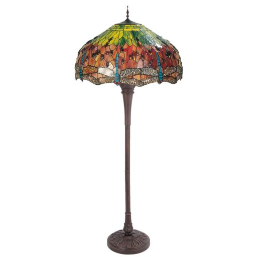 Bronzos barna színű polyresin vázas álló lámpa 60cm átmérőjű szitakötő dekoros, dominánsan zöld és narancs árnyalatú Tiffany üveg búrával, húzókapcsolóval. A lámpában 3 db külön kapcsolható E27-es foglalat található.