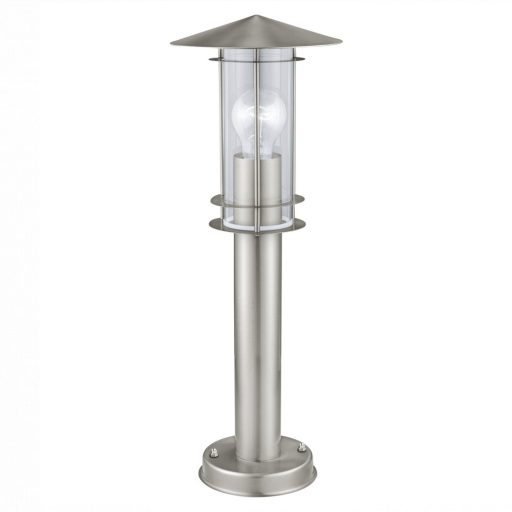 Klasszikus nemesacél vázas kültéri álló lámpa, átlátszó üveg betétes búrával. A lámpa IP44-es védelemmel rendelkezik.