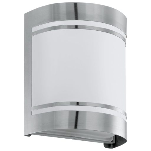Modern stílusú, rozsdamentes acél vázas kültéri fali lámpa, szatinált üveg búrával. A lámpa IP44-es védelemmel rendelkezik.
