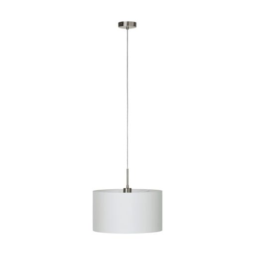 Matt nikkel színű acél vázas függeszték fehér színű textil lámpaernyővel.