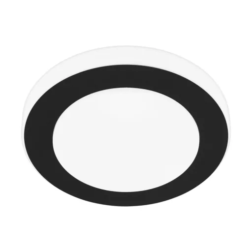 Fekete és fehér színű acél keretes fürdőszobai mennyezeti lámpa fehér műanyag búrával. A lámpa beépített LED fényforrással és IP44-es védelemmel rendelkezik. Fényerőszabályzós kapcsolóval nem használható.