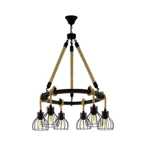Fekete színű vázas vintage stílusú függeszték fekete színű fémrács búrával, kötél dekorral.