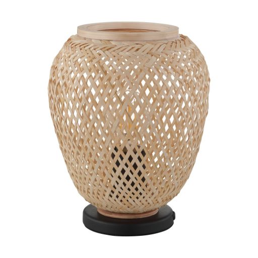 Fekete színű fém vázas asztali lámpa natúr színű fábol készült rácsos búrával, vezetékre szerelt kapcsolóval.