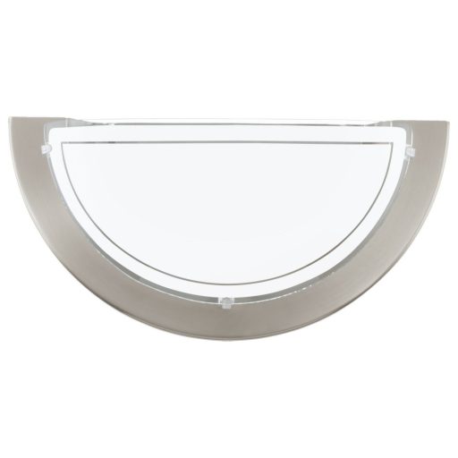 Matt nikkel színű acél keretes fali lámpa, fehér színű, áttetsző sávos lakkozott üveg búrával.