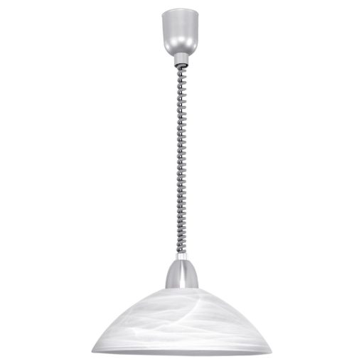 Ezüst színű műanyag felfogatásos függeszték, fehér színű alabástrom üveg búrával, matt nikkel betéttel. A lámpa magassága a spirál kábellel állítható.