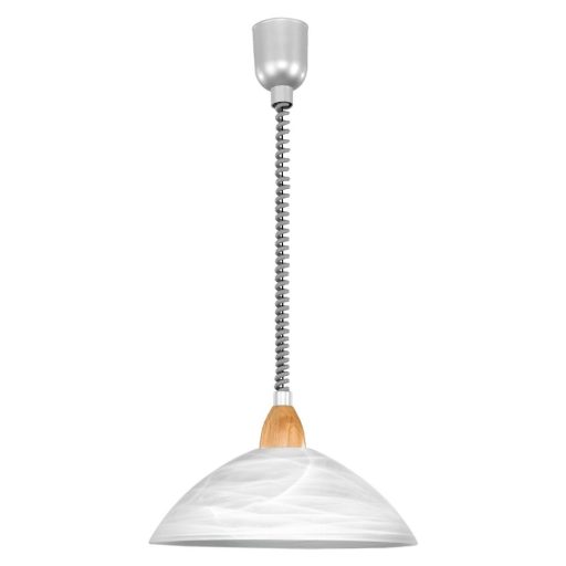 Ezüst színű műanyag felfogatásos függeszték, fehér színű alabástrom üveg búrával, bükk színű fa betéttel. A lámpa magassága a spirál kábellel állítható.