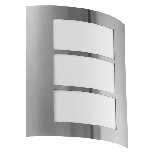 Modern stílusú, rozsdamentes acél vázas kültéri fali lámpa, fehér színű műanyag búrával. A lámpa IP44-es védelemmel rendelkezik.