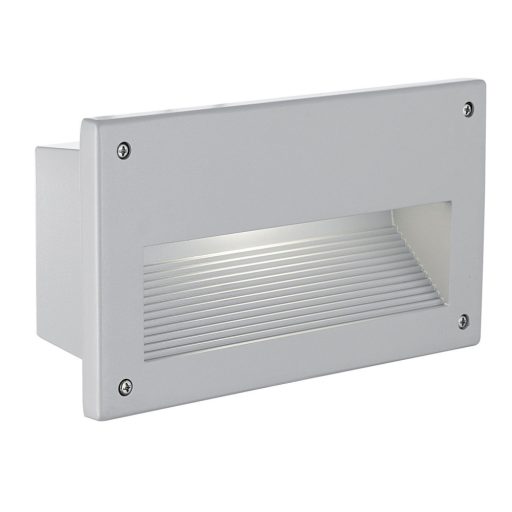 Modern stílusú, ezüst színű, alumínium falba építhető lámpa, szatinált üveg betéttel, IP44-es védelemmel.