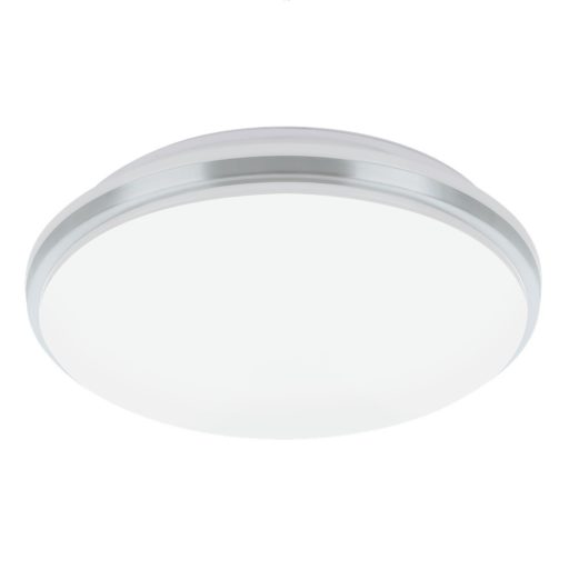 Fehér színű fém vázas fürdőszobai mennyezeti lámpa fehér-króm színű műanyag búrával, természetes fehér színhőmérsékletű beépített led fényforrással, IP44-es védelemmel.