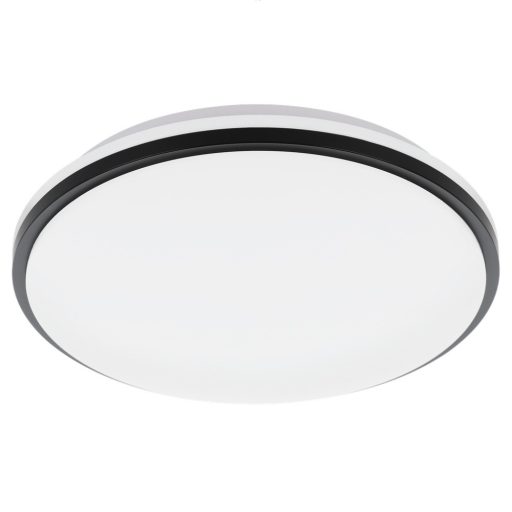 Fehér színű fém vázas fürdőszobai mennyezeti lámpa fekete-fehér színű műanyag búrával, természetes fehér színhőmérsékletű beépített led fényforrással, IP44-es védelemmel.