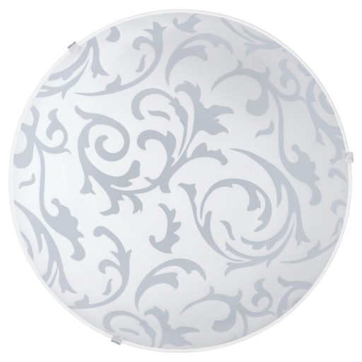 Fehér színű acél vázas mennyezeti lámpa, fehér alapon áttetsző inda mintás szatinált üveg búrával.