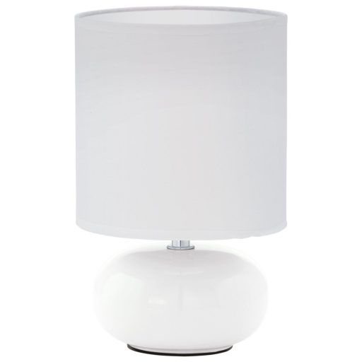 Fehér színű kerámia vázas, textil lámpaernyős asztali lámpa vezetékre szerelt kapcsolóval.