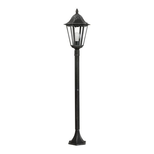 Klasszikus stílusú, fekete színű, ezüst patinás alumíniumöntvény kültéri állólámpa, átlátszó üveg betéttel. A lámpa IP44-es védelemmel rendelkezik.