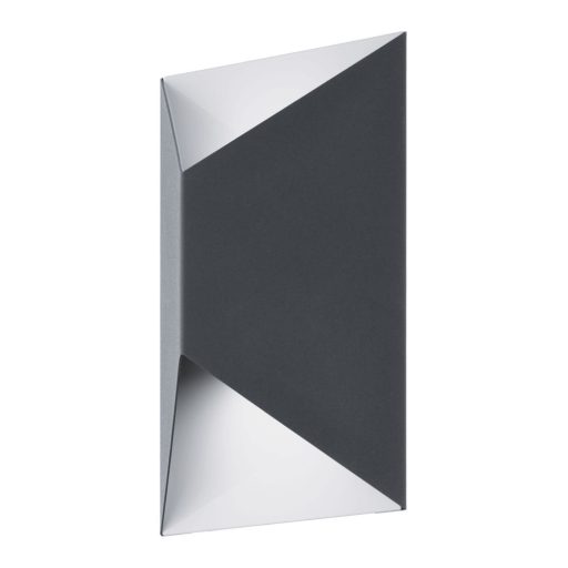 Modern stílusú, antracit és fehér színű galvanizált acél vázas kültéri fali lámpa. A lámpa beépített LED fényforrással és IP44-es védelemmel rendelkezik. Fényerőszabályzós kapcsolóval nem használható.