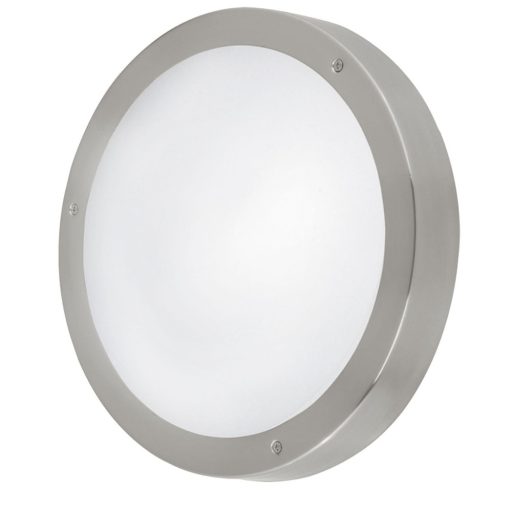 Rozsdamentes acél vázas kerek, kültéri fali/mennyezeti lámpa, fehér színű műanyag búrával. A lámpa beépített LED fényforrással és IP44-es védelemmel rendelkezik. Fényerőszabályzós kapcsolóval nem használható.