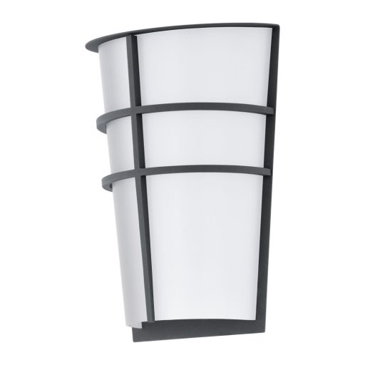 Modern stílusú, antracit színű galvanizált acél vázas kültéri fali lámpa, fehér színű műanyag búrával. A lámpa beépített LED fényforrással és IP44-es védelemmel rendelkezik. Fényerőszabályzós kapcsolóval nem használható.