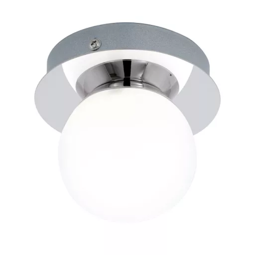 Króm színű nemesacél vázas fali/mennyezeti lámpa, lakkozott, fehér színű opál üveg búrával. A lámpa beépített LED fényforrással, IP44-es védelemmel rendelkezik. Fényerőszabályzós kapcsolóval nem használható.