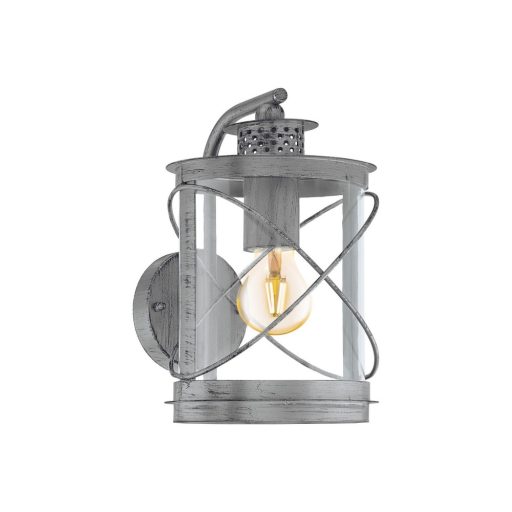 Klasszikus stílusú, antik ezüst színű, galvanizált acél vázas kültéri fali lámpa, átlátszó műanyag búrával. A lámpa IP44-es védelemmel rendelkezik.