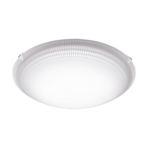Fehér színű acél vázas fali/mennyezeti lámpa fehér, a szélén áttetsző mintás üveg búrával, beépített LED fényforrással. Fényerőszabályzós kapcsolóval nem használható.