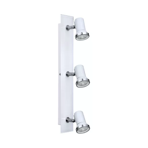 Fehér színű acél vázas mennyezeti spot lámpa fém búrával, króm színű kerettel, az alján üveg lappal. A lámpa állítható fejjel és IP44-es védelemmel rendelkezik.