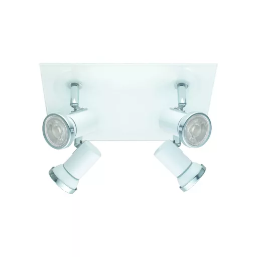 Fehér színű acél vázas mennyezeti spot lámpa fém búrával, króm színű kerettel, az alján üveg lappal. A lámpa állítható fejjel és IP44-es védelemmel rendelkezik.