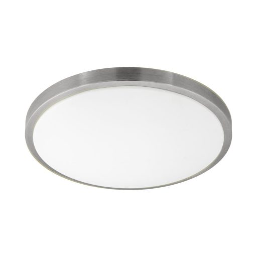 Fehér színű acél vázas fali/mennyezeti lámpa matt nikkel keretes fehér műanyag búrával, beépített LED fényforrással. Fényerőszabályzós kapcsolóval nem használható.