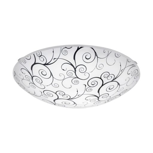 Fehér színű acél vázas fali/mennyezeti lámpa fehér színű üveg búrával, fekete és áttetsző inda dekorral, beépített LED fényforrással. Fényerőszabályzós kapcsolóval nem használható.