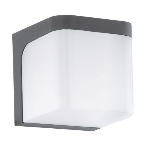 Modern stílusú, kocka alakú, antracit színű, alumínium vázas kültéri falikar. Búrája fehér színű műanyag. A lámpa beépített LED fényforrással és IP44-es védelemmel rendelkezik. Fényerőszabályzós kapcsolóval nem használható.