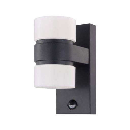 Modern stílusú, antracit színű, alumíniumöntvény fali lámpa, fehér műanyag búrával. A lámpa mozgás-érzékelővel, beépített LED fényforrással és IP44-es védelemmel rendelkezik. Fényerőszabályzós kapcsolóval nem használható.