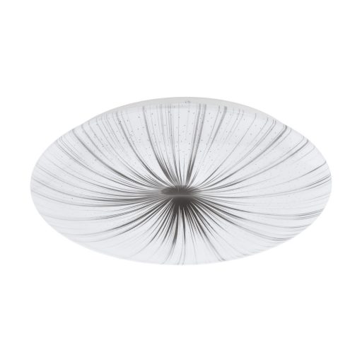 Fehér színű fém vázas mennyezeti lámpa fehér alapon szürke dekoros műanyag búrával, beépített LED fényforrással. Fényerőszabályzós kapcsolóval nem használható.