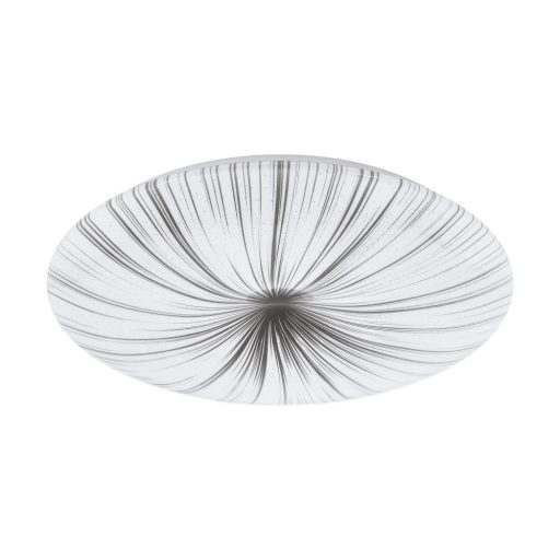 Fehér színű fém vázas mennyezeti lámpa fehér alapon szürke dekoros műanyag búrával, beépített LED fényforrással. Fényerőszabályzós kapcsolóval nem használható.