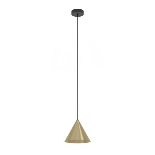 Fekete színű fém vázas függeszték arany színű fém búrával, E27-es foglalattal.