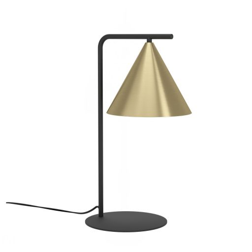 Fekete színű fém vázas komód lámpa arany színű fém búrával, E27-es foglalattal. A lámpa egyéb tulajdonsága(i): vezetékre szerelt kapcsoló.