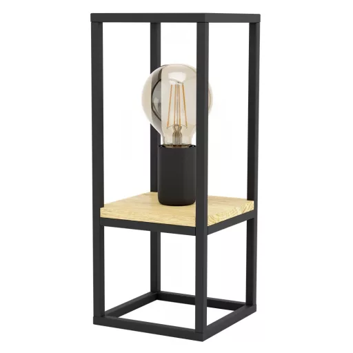 Fekete-barna színű fém és fa vázas éjjeli lámpa, E27-es foglalattal. A lámpa egyéb tulajdonsága(i): vezetékre szerelt kapcsoló.
