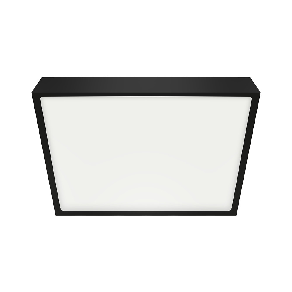 Matt fekete színű fém keretes, műanyag búrás mennyezeti lámpa 12W hideg fehér fényű beépített LED fényforrással, IP44-es védelemmel.