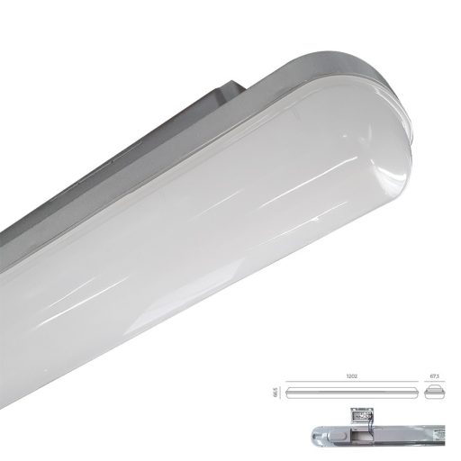 Szürke színű műanyag mennyezeti lámpa opálos műanyag búrával, 36W higed fehér fényű beépített LED fényforrással, IP65-ös védelemmel.