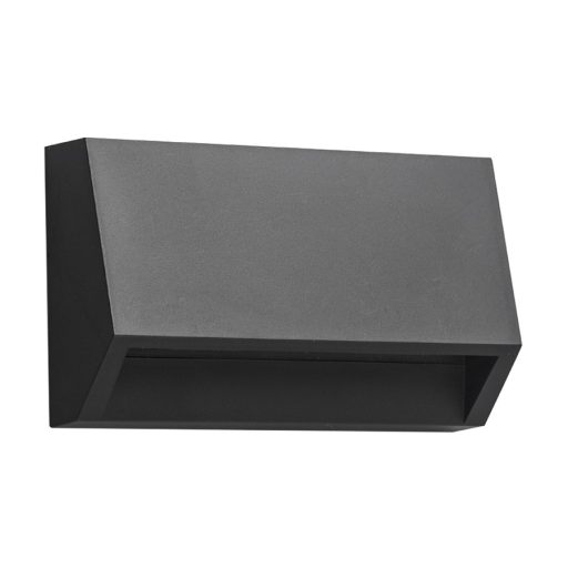 Sötét szürke színű műanyag falra szerelhető lépcső világító lámpa 2W higed fehér fényű beépített LED fényforrással, IP65-ös védelemmel.