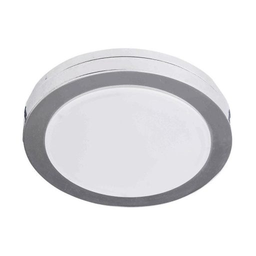 Króm színű fém vázas mennyezetbe építhető spot lámpa matt fehér műanyag betéttel, beépített LED fényforrással és IP44-es védelemmel.