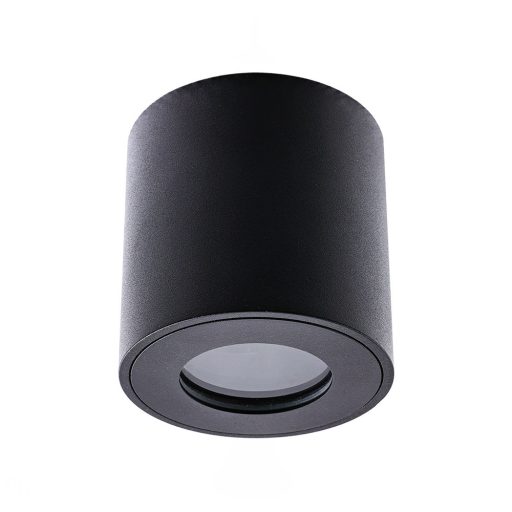 Matt fekete színű alumínium felületre szerelhető fix mennyezeti spot lámpa GU10-es foglalattal, IP44-es védelemmel.
