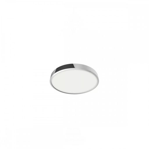 Króm színű fém keretes mennyezeti lámpa fehér színű műanyag búrával, beépített LED fényforrással, IP44-es védelemmel.
