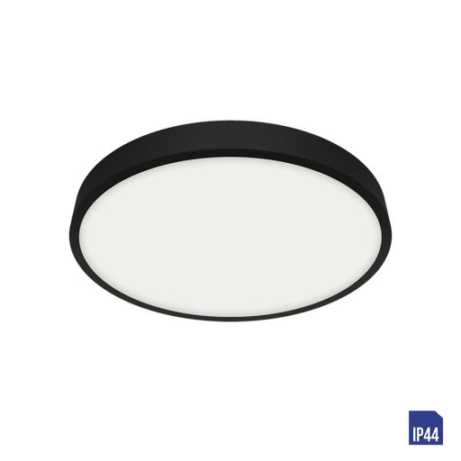 Matt fekete színű fém keretes, műanyag búrás mennyezeti lámpa 12W hideg fehér fényű beépített LED fényforrással, IP44-es védelemmel.