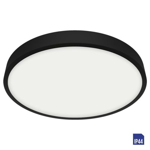 Matt fekete színű fém keretes, műanyag búrás mennyezeti lámpa 30W hideg fehér fényű beépített LED fényforrással, IP44-es védelemmel.