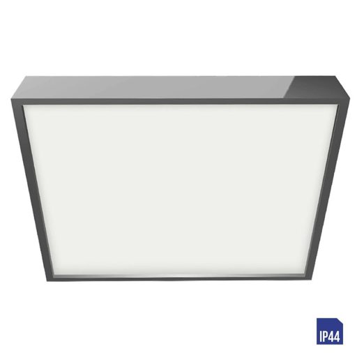 Fényes króm színű fém keretes, műanyag búrás mennyezeti lámpa 30W hideg fehér fényű beépített LED fényforrással, IP44-es védelemmel.