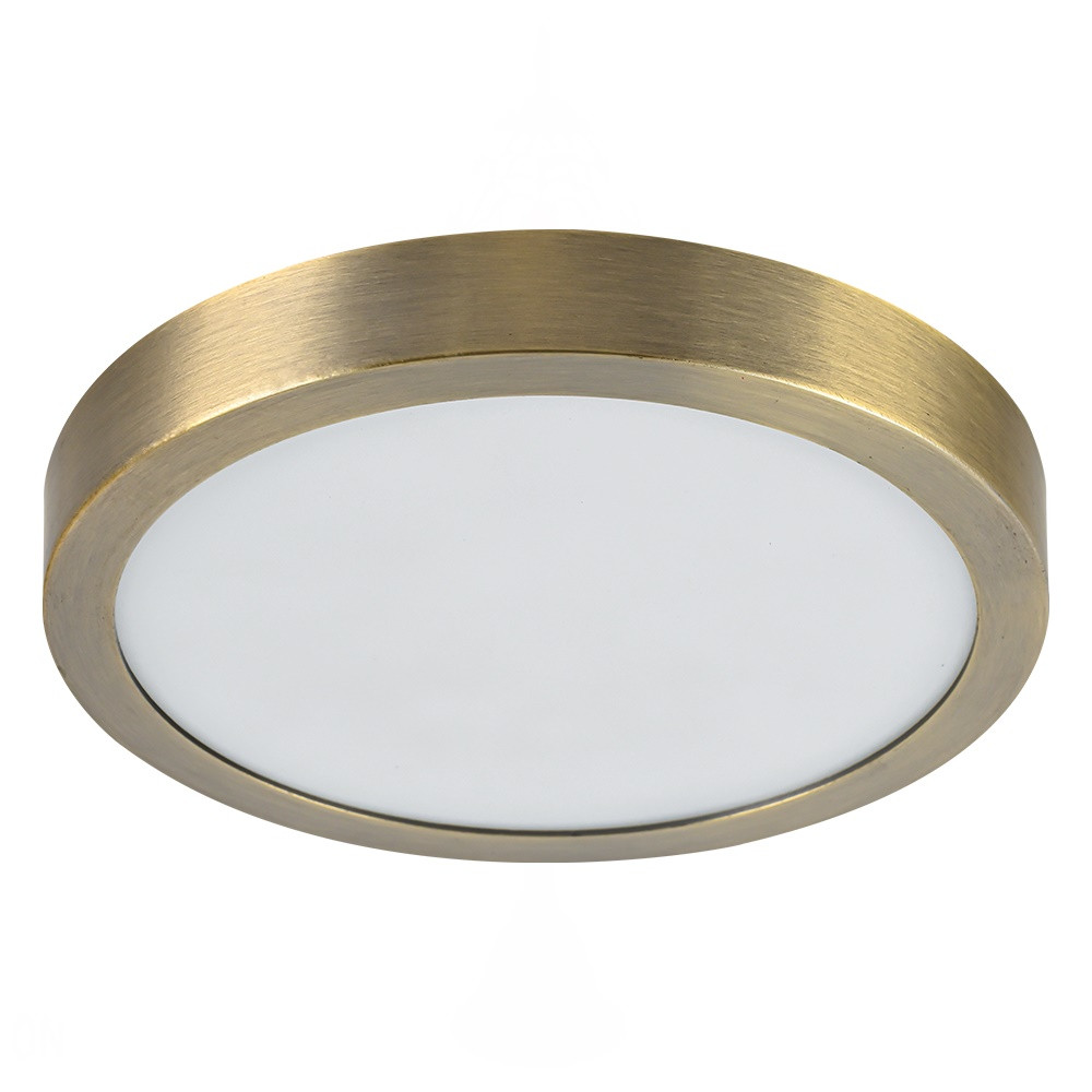 30cm átmérőjű antik sárgaréz színű alumínium keretes mennyezeti lámpa fehér színű műanyag búrával, természetes fehér színhőmérsékletű beépített LED fényforrással.