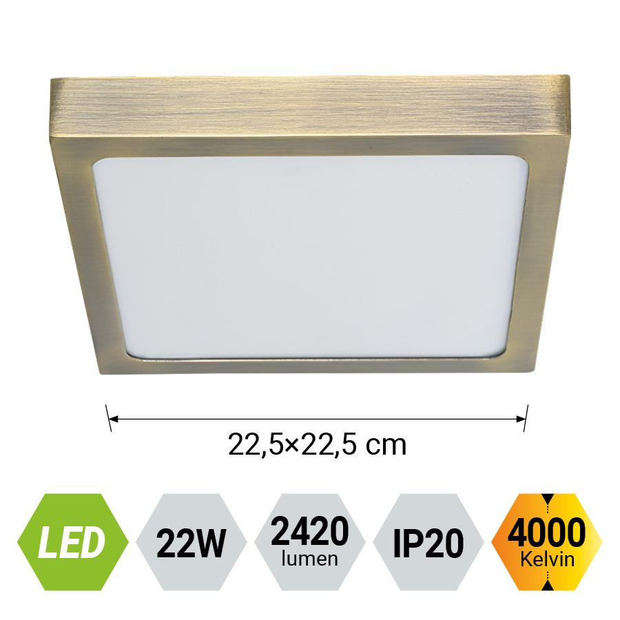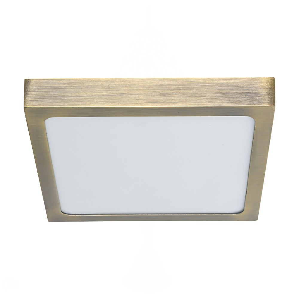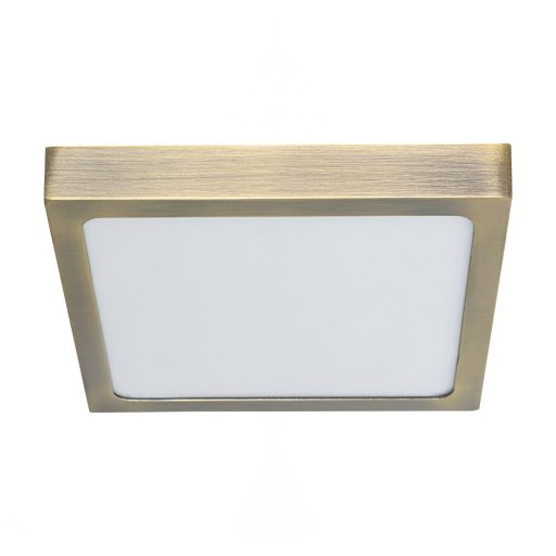22,5cm széles antik sárgaréz színű alumínium keretes mennyezeti lámpa fehér színű műanyag búrával, természetes fehér színhőmérsékletű beépített LED fényforrással.