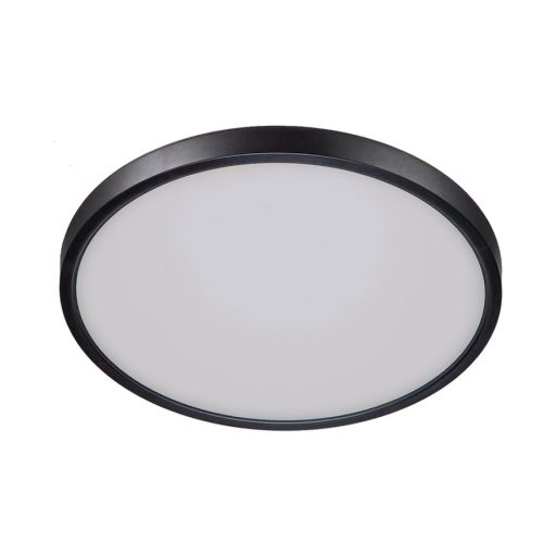 Fekete színű műanyag vázas kerek mennyezeti lámpa fehér színű acryl búrával, természetes fehér színhőmérsékletű beépített LED fényforrással.